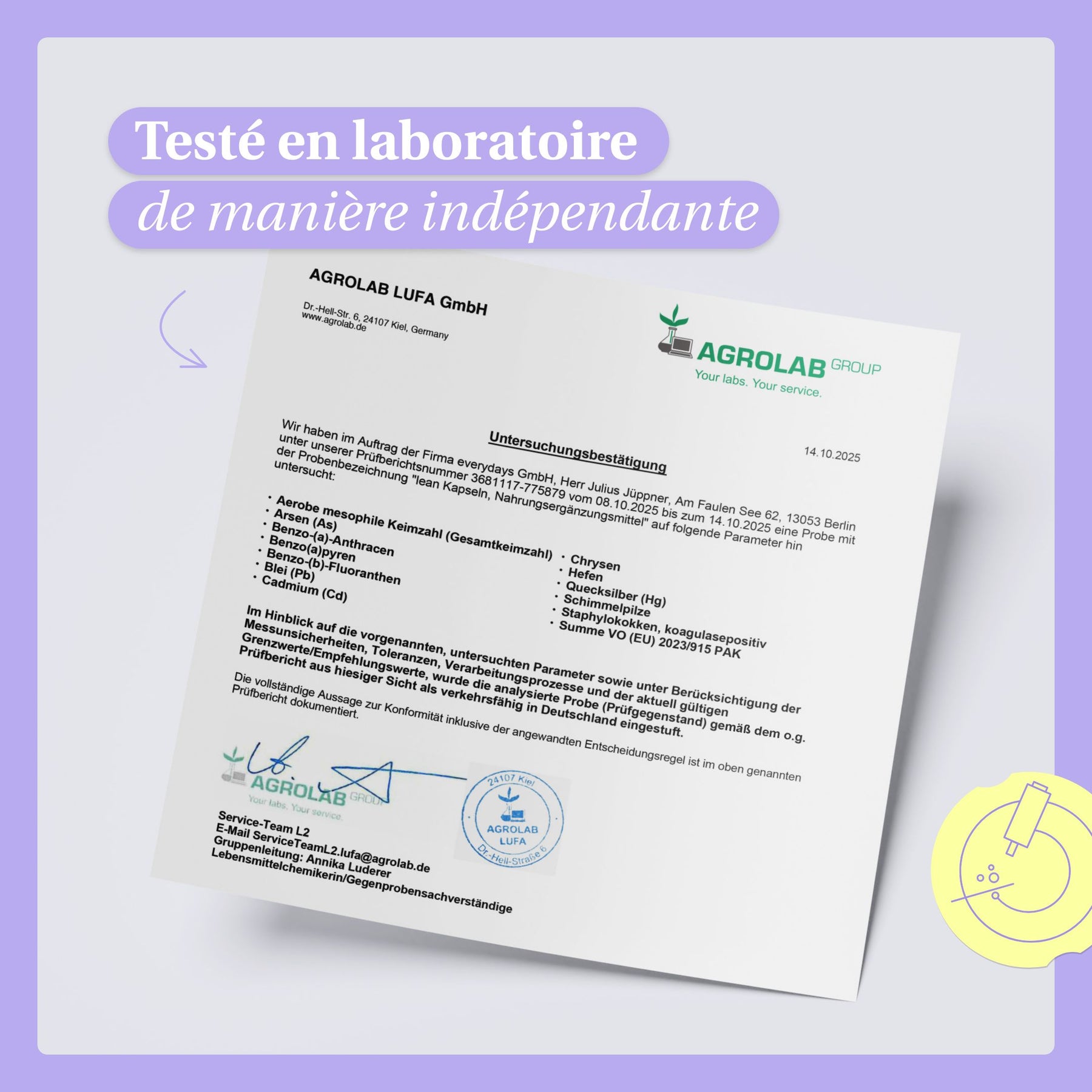 Nous faisons régulièrement tester nos produits par des laboratoires indépendants. Tu trouveras ici les certificats d'analyse actuels - pour un maximum de transparence et de confiance dans ta routine quotidienne.